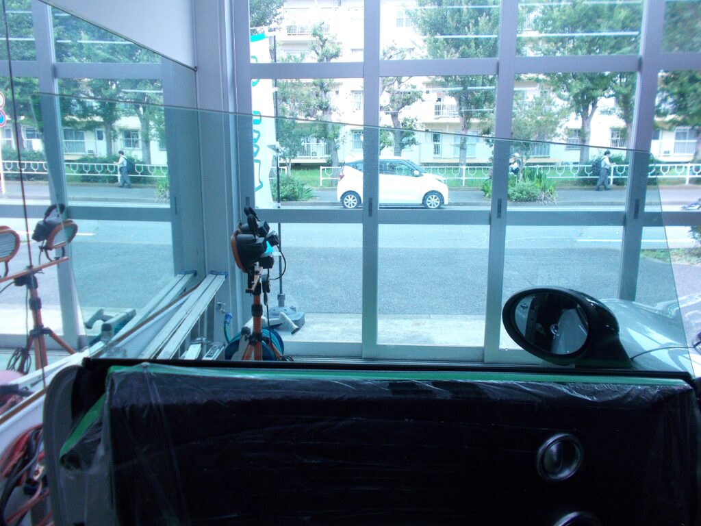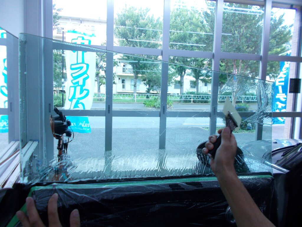 ウインコス透明高断熱フィルムIR-85施工中の写真です。
