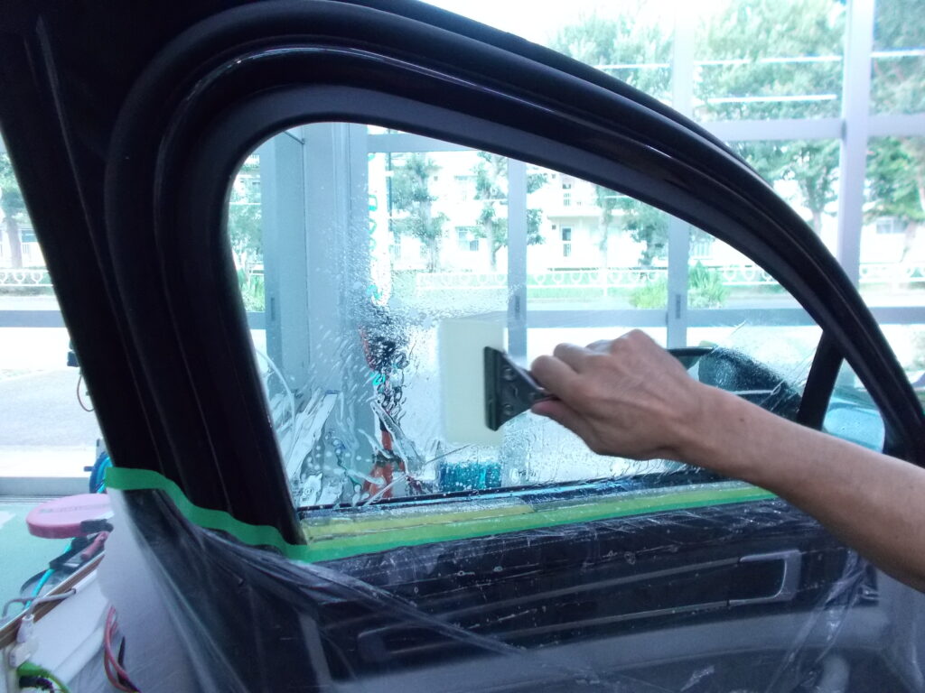 ウインコス透明高断熱フィルムIR-85施工中の写真です。