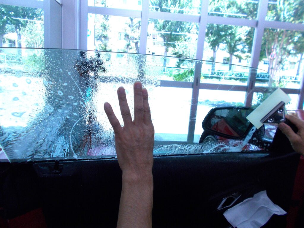 ウインコス透明高断熱フィルムIR-85施工中の写真です。