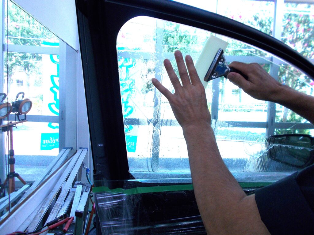 ウインコス透明高断熱フィルムIR-85施工中の写真です。