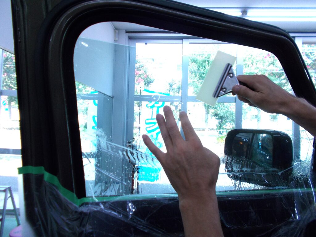 ウインコス透明高断熱フィルムIR-85施工中の写真です。
