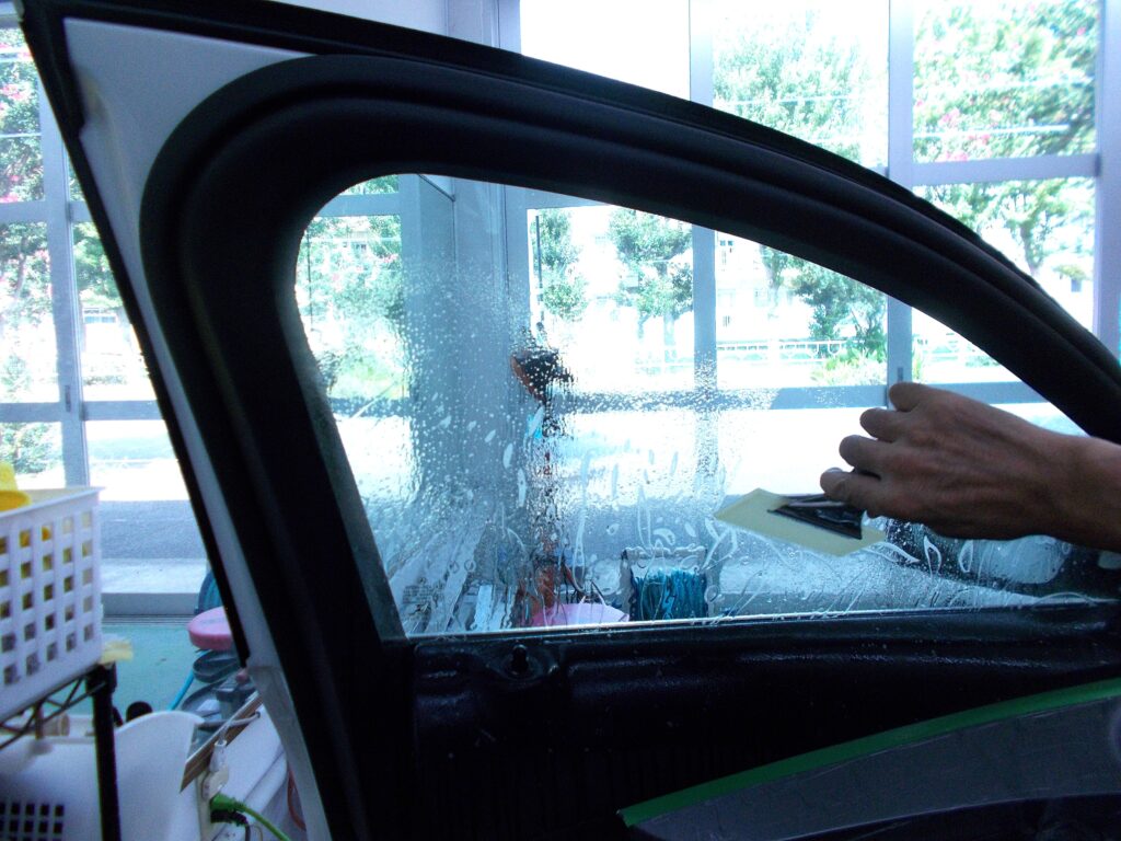 ウインコス透明高断熱フィルムIR-85施工中の写真です。