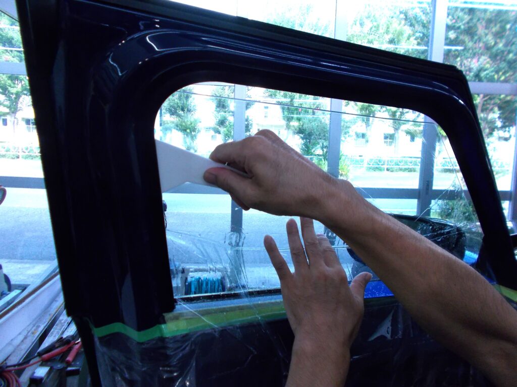 ウインコス透明高断熱フィルムIR-85施工中の写真です。