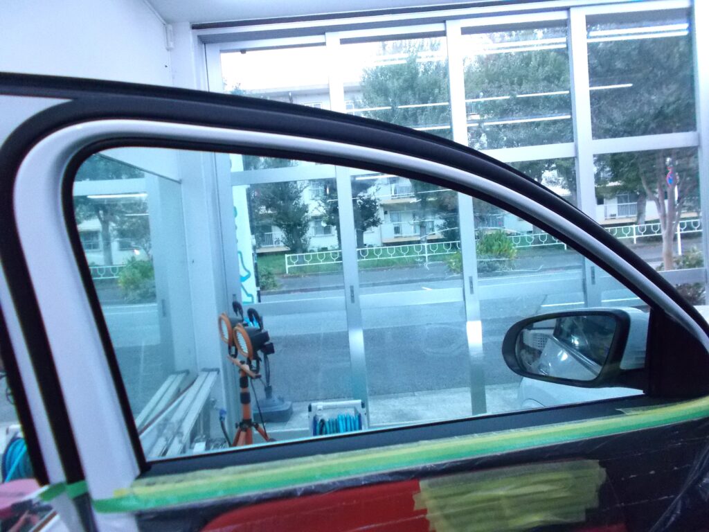ウインコス透明高断熱フィルムIR-85施工中の写真です。